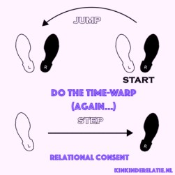 De meest kenmerkende stap voor relational consent vind ik persoonlijk de ‘time-warp’ die je kunt maken door jezelf tevoren af te vragen:
